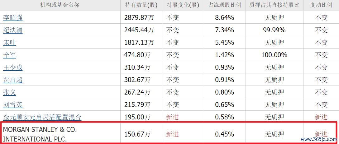 三季度,摩根斯坦利新进150万股,位列第十大流通股东。